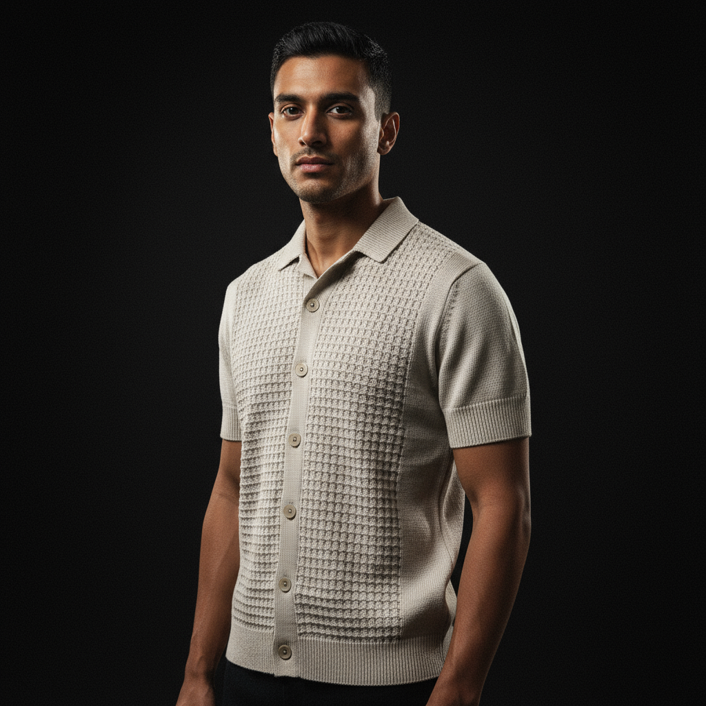 This casual textured-knit stone short-sleeve shirt is a versatile staple for your casual wardrobe. It’s the perfect choice for layering or wearing solo on laid-back weekends.